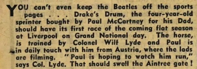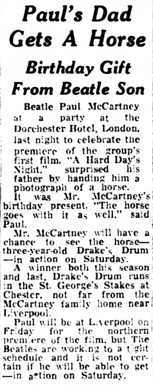 On March 31, 1964, through a discussion with “A Hard Day’s Night” producer Denis O’Dell, Paul McCartney acquired a race horse for his father’s birthday. On this day, he let him know about his birthday gift.