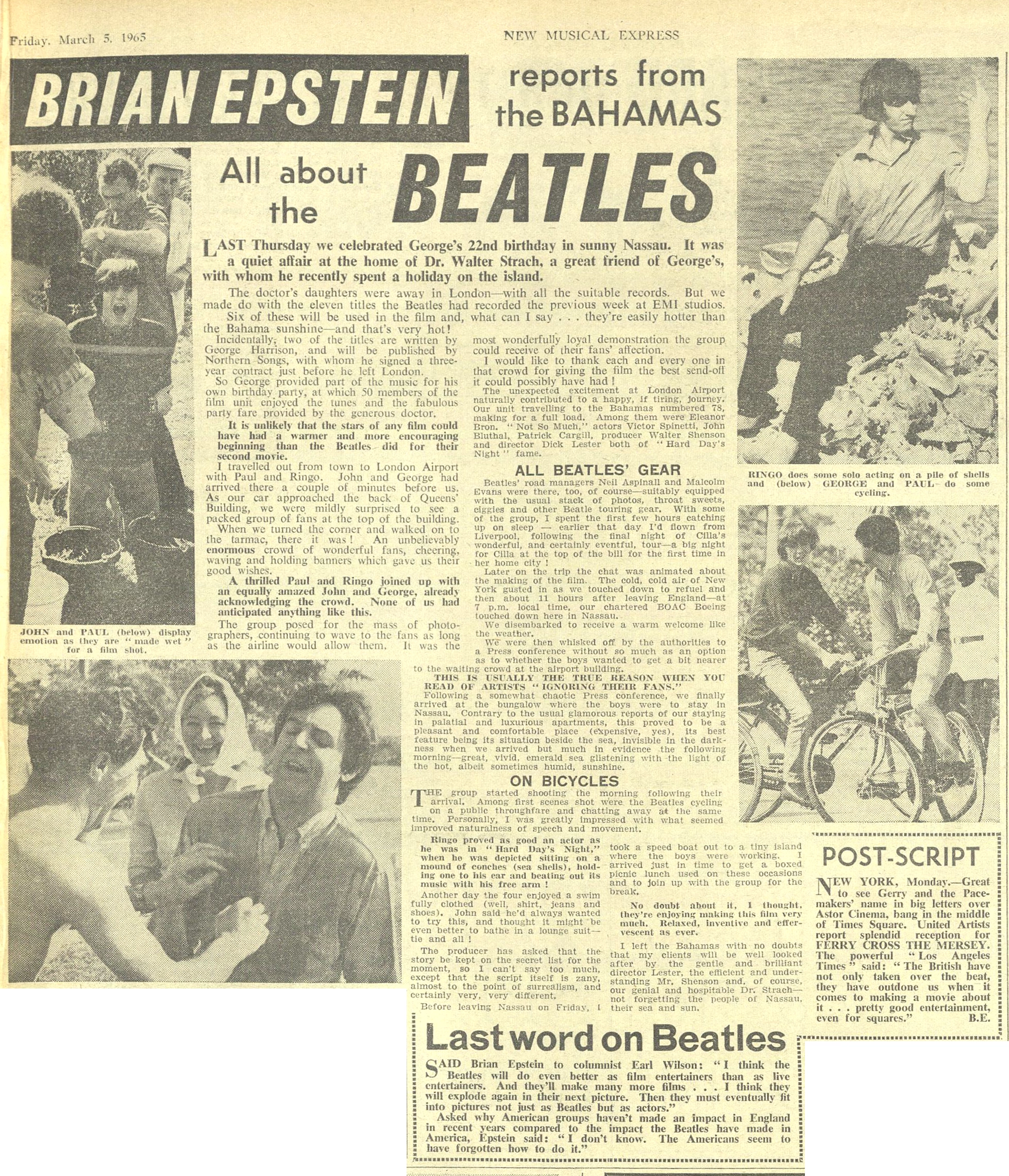 Article Feb 28, 1965 • Filming “Help!” in the Bahamas • Day 6