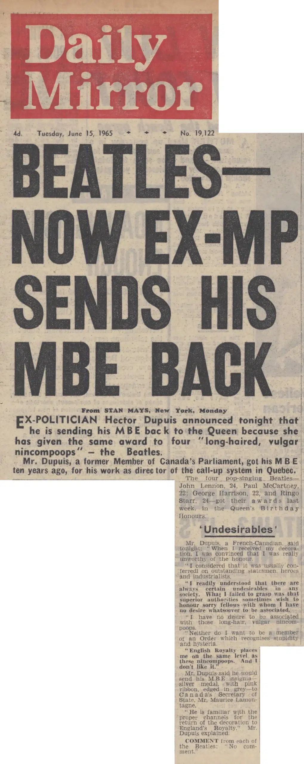 Article June 1965 • Several recipients return their MBEs ahead of The Beatles’ investiture