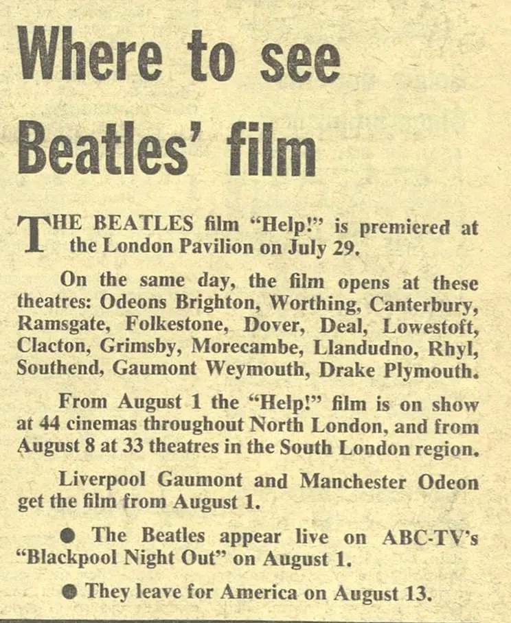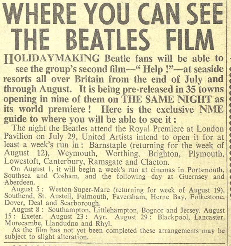 Simultaneous with the premiere in London, Help! also went on general release in a selection of English seaside towns