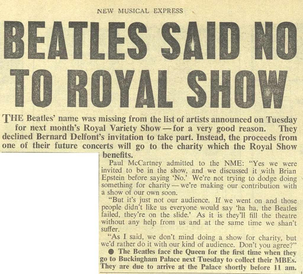 In an interview with NME, Paul McCartney explained that The Beatles felt the Royal Variety Show was not really their audience, adding that they intended instead to stage a charity concert of their own. This plan never came to fruition, although the group had previously taken part in a charity event in December 1964, during their “Another Beatles Christmas Show” residency.
