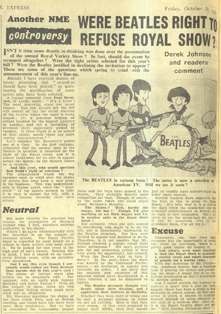Article October 1965 • The Beatles refuse to participate in the Royal Variety Show