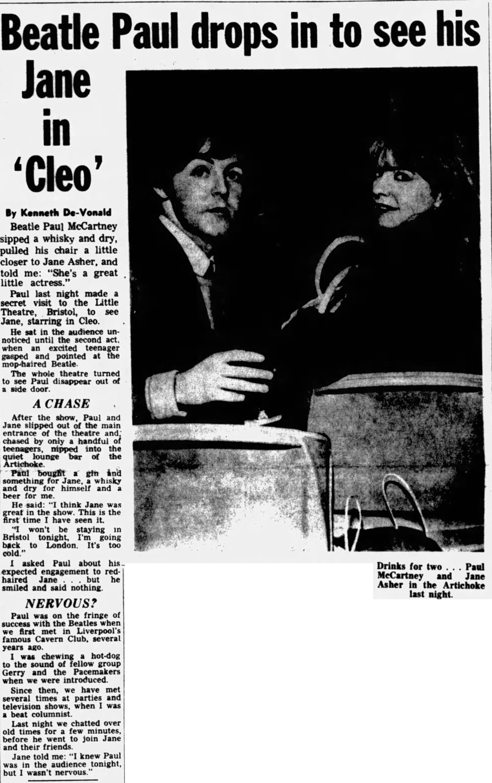 Paul last night made a secret visit to the Little Theatre, Bristol, to see Jane, starring in Cleo. He sat in the audience unnoticed until the second act, when an excited teenager gasped and pointed at the mop-haired Beatle. The whole theatre turned to see Paul disappear out of a side door.