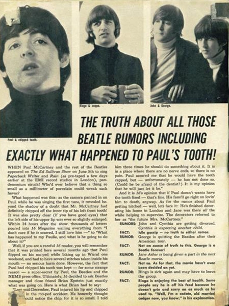 Well, if you are a careful 16 reader, you will remember that it was printed here several months ago that Paul flipped on his mo-ped while biking up in Wirral one weekend, and had to have several stitches taken inside his mouth — no serious harm done. However, the fact that Paul had chipped his tooth was kept — for some strange reason — a super-secret by Paul, the Beatles and the NEMS press office. Ultimately, 16 decided to ask Beatles manager and close friend Brian Epstein just exactly what was going on. Here is what Brian had to say: