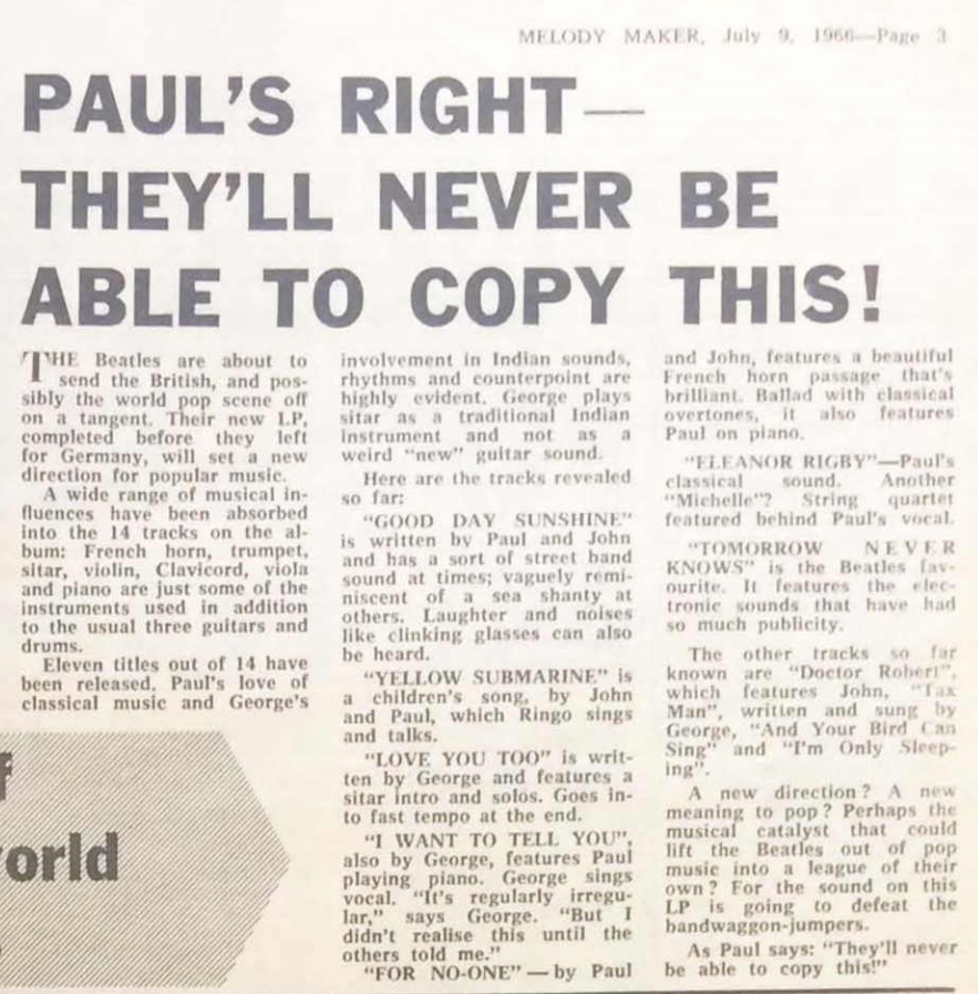 The Beatles are about to send the British, and possibly the world pop scene off on a tangent. Their new LP, completed before they left for Germany, will set a new direction for popular music. A wide range of musical influences have been absorbed into the 14 tracks on the album: French horn, trumpet, sitar, violin, Clavicord, viola and piano are just some of the instruments used in addition to the usual three guitars and drums. Eleven titles out of 14 have been released. Paul’s love of classical music and George’s involvement in Indian sounds, rhythms and counterpoint are highly evident. George plays sitar as a traditional Indian Instrument and not as a weird “new” guitar sound Here are the tracks revealed so far: