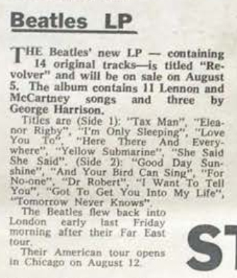 The title of the Beatles’ next album has been announced: it is “Revolver.” The LP will be issued next month, although an exact date has still to be fixed. Titles on side one are “Tax Man,” “Eleanor Rigby,” “I’m Only Sleeping,” “Love You To,” “Here There And Everywhere,” “Yellow Submarine” and “ She Said, She Said.” On side two are “Good Day Sunshine,” “And Your Bird Can Sing,” “For No One,” “Dr. Robert,” “I Want To Tell You,” “Got To Get You Into My Life” and “Tomorrow Never Knows.”