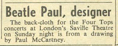 The back-cloth for the Four Tops concerts at London’s Saville Theatre on Sunday night is from a drawing by Paul McCartney.