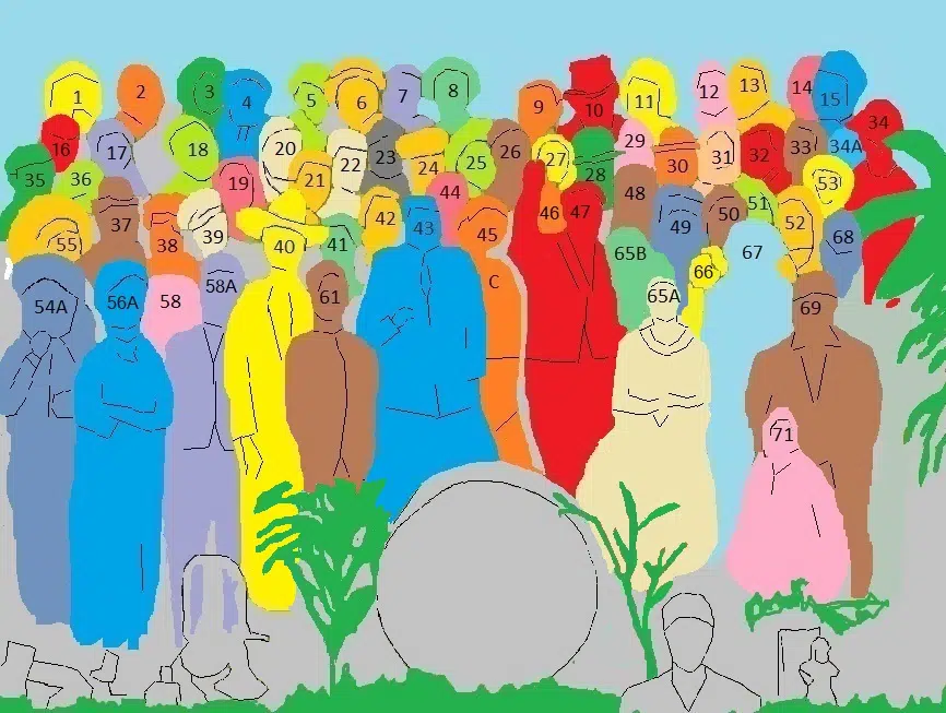 - (36) Anonymous (hairdresser’s wax dummy) – On the opposite side of the gathering to the first wax dummy (No.24), this second dummy takes its place next to Stuart Sutcliffe (No.35)