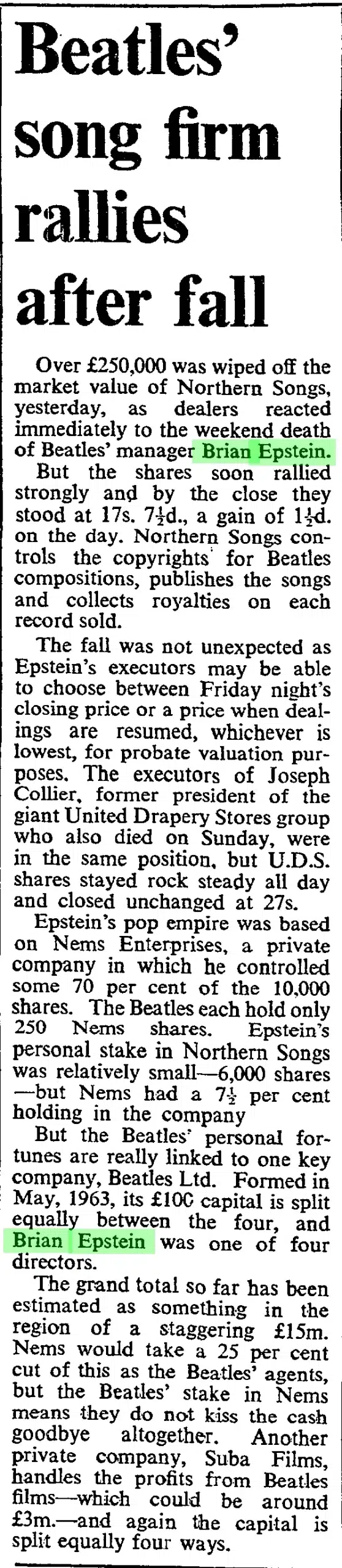 Over £250,000 was wiped off the market value of Northern Songs, yesterday, as dealers reacted immediately to the weekend death of Beatles’ manager Brian Epstein. But the shares soon rallied strongly and by the close they stood at 17s. 7 1/2d., a gain of 1 1/2d. on the day. Northern Songs controls the copyrights for Beatles compositions, publishes the songs and collects royalties on each record sold.