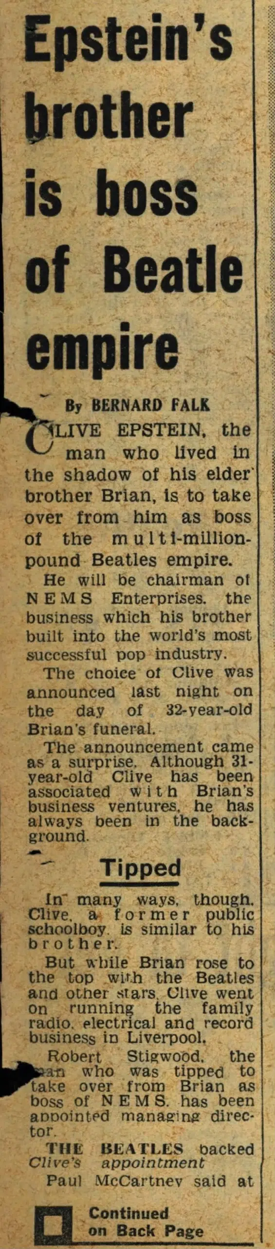 CLIVE EPSTEIN, the man who lived in the shadow of his elder brother Brian, is to take over from him as boss of the multi-million pound Beatles empire. He will be chairman of NEMS Enterprises, the business which his brother built into the world’s most successful pop industry. The choice of Clive was announced last night on the day of 32-year-old Brian’s funeral.