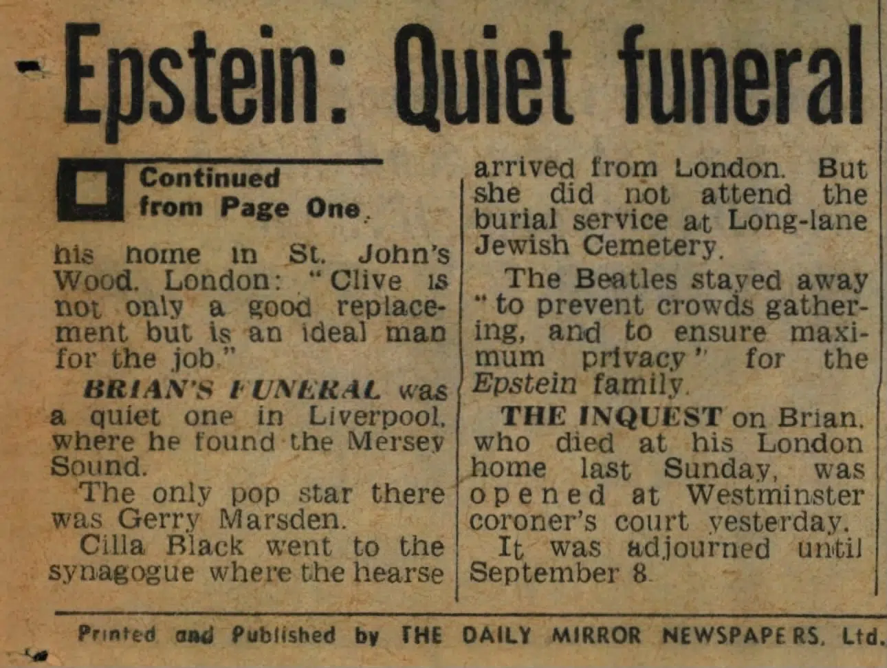 BRIAN’S FUNERAL was a quiet one in Liverpool, where he found the Mersey Sound. The only pop star there was Gerry Marsden. Cilla Black went to the synagogue where the hearse arrived from London. But she did not attend the burial service at Long-lane Jewish Cemetery. The Beatles stayed away “to prevent crowds gathering, and to ensure maximum privacy” for the Epstein family.