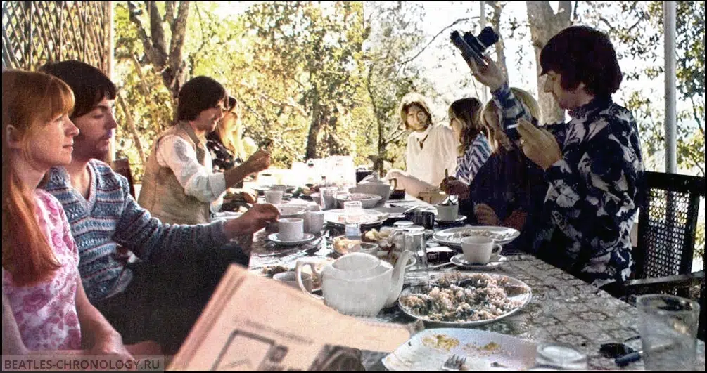 The Beatles and their group ate at the table by the cliff, shaded by a flat thatched roof covered with vines and held up by white wooden poles. Breakfasts were cereal, toast, juice, tea and coffee. Lunch and dinners were soup, plain basmati rice, and bland but nutritious vegetarian dishes with almost no spices.