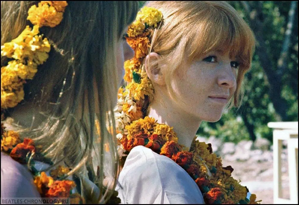 George, the leader of the Beatle pilgrimage, and John attended the Maharishi’s first lecture today along with sixty other devotees, including Sinatra’s wife, 22-year-old Mia Farrow — who now wears robes and carries a staff. Also in the Beatle party is Patti Boyd’s 20-year-old sister Jenny.