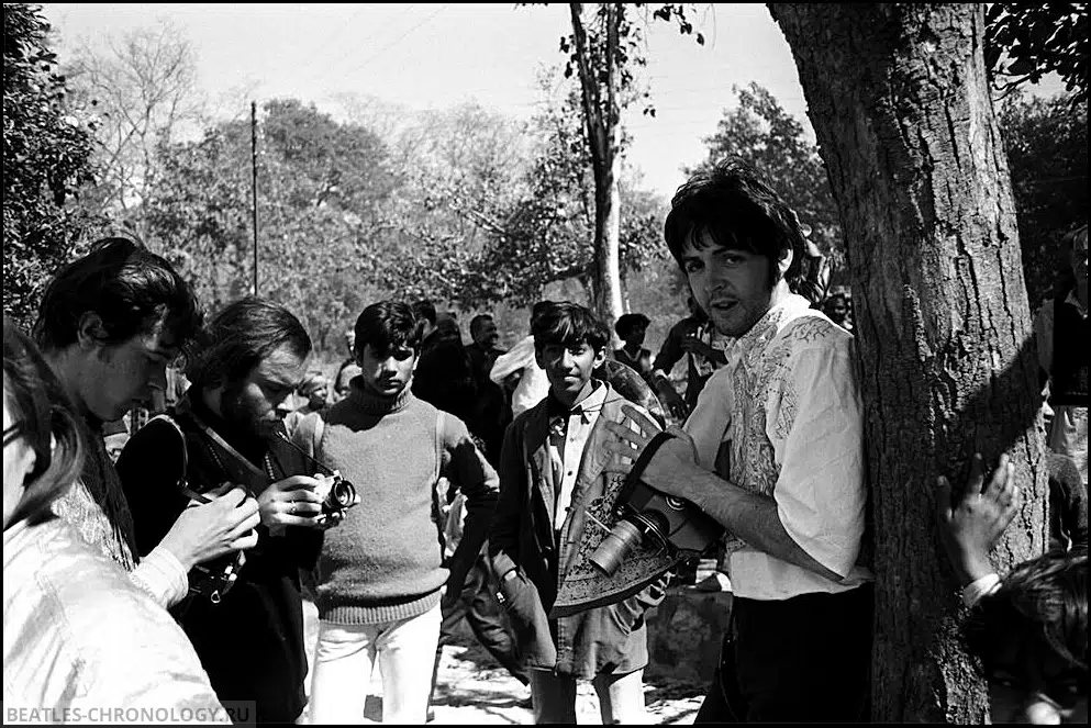 Photo by Paul Saltzman – From John C Stoskopf: The Beatles of 1968 (johnstoskopf.blogspot.com)“I first saw John, Paul, George and Ringo sitting outside at a long table by the edge of the cliff that overlooked the Ganges and Rishikesh. Somewhat nervously, I walked over. “May I join you?” I asked. “Sure, mate, pull up a chair.” And Paul said, pointing beside him, “Come and sit here.” Taken later, I named this for Paul playing with his baby finger.”