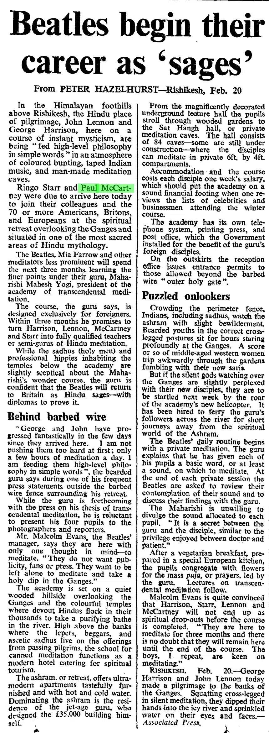 Rishikesh, Feb. 20. — George Harrison and John Lennon today made a pilgrimage to the banks of the Ganges. Squatting cross-legged in silent meditation, they dipped their hands into the icy river and sprinkled water on their eyes and faces. — Associated Press.