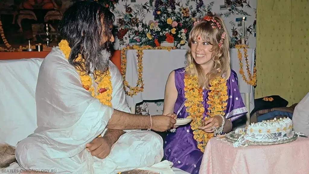 On March 17, Pattie Harrison celebrated her 24th birthday. A number of photographs from the occasion were published in one of the April 1968 issue of Disc and Music Echo. These included images of Pattie receiving her birthday cake, The Beatles with local entertainer Shah Jahan and their flautist friend Paul Horn, George Harrison checking a yogi’s pulse, and Paul McCartney playing a tamboura.