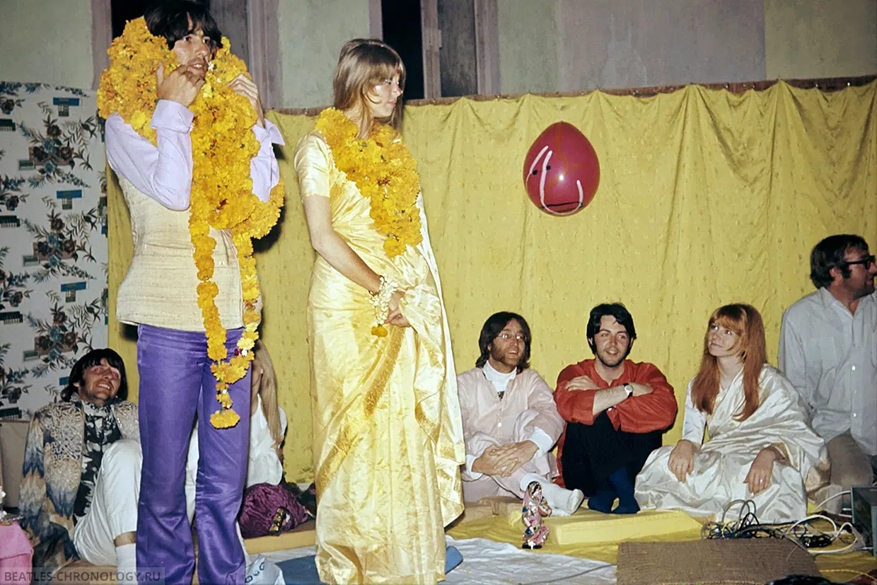 On February 25, 1968, George Harrison celebrated his 25th birthday. A party was held in his honour, featuring communal chanting, a sitar performance by George, and a firework display. During the celebration, the Maharishi presented him with a plastic globe of the world, deliberately placed upside down. “George, the globe I am giving you symbolizes the world today. I hope you will help us all in the task of putting it right,” he said. George promptly turned the globe upright, replying, “I’ve done it!”, which drew warm applause from the other students present.