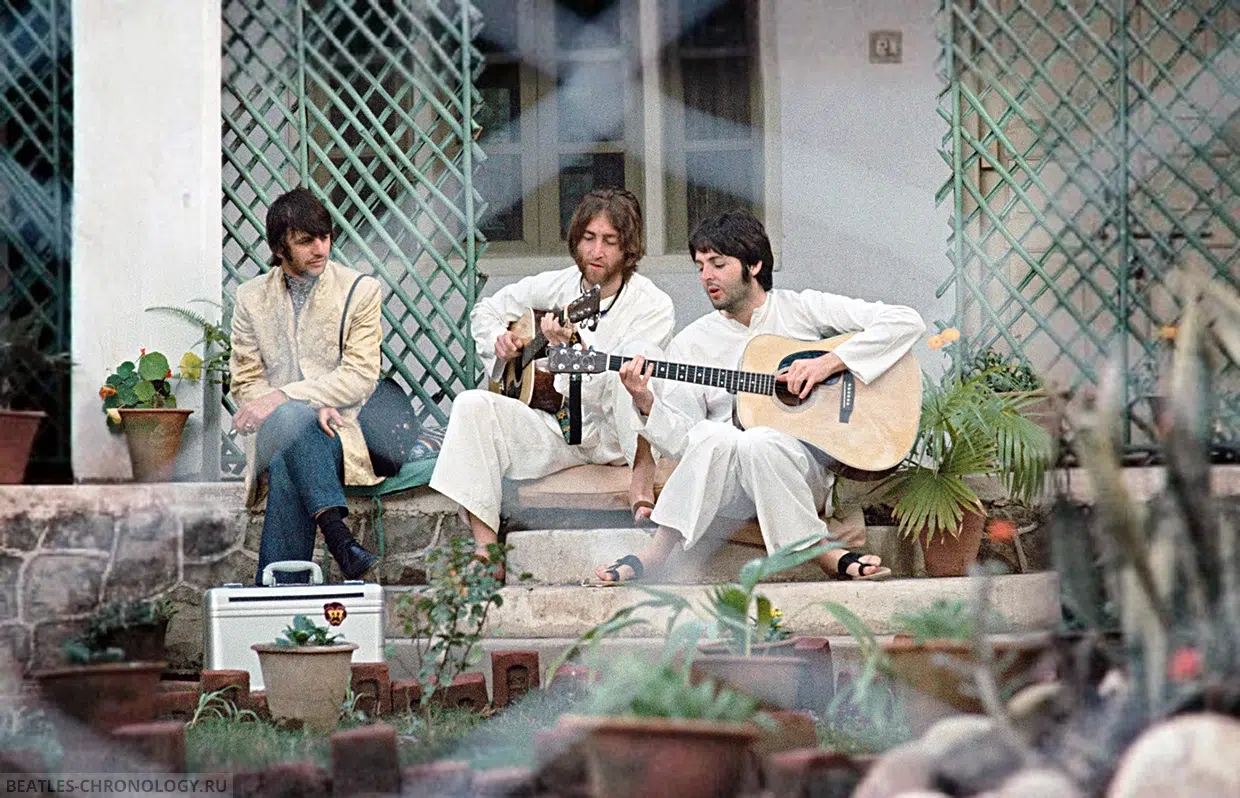 Later that afternoon, I heard guitars and the sound of Paul’s and John’s voices. They were sitting with Ringo among the potted plants on the steps of their bungalow. […] They were strumming their Martin acoustic guitars, singing fragments of songs, musically meandering through some of my favorites: “Michelle,” “All You Need Is Love,” “Norwegian Wood,” “Eleanor Rigby,” and others. Ringo was dressed in his favorite heavy, gold-brocade Nehru jacket and jeans […] John and Paul wore white cotton kurta pajamas, the most comfortable clothers to wear in India […] Paul started strumming again and John joined in. Paul had a pad of paper sitting on the step beneath him, and he started to sing the words that he had scribbled down. It was the chorus to “Ob-La-Di, Ob-La-Da.” They repeated it over and over again, and when they stopped Paul looked at me with a twinkle in his eyes and Said, “That’s all there is so far We’ve got the chorus but no words yet.”