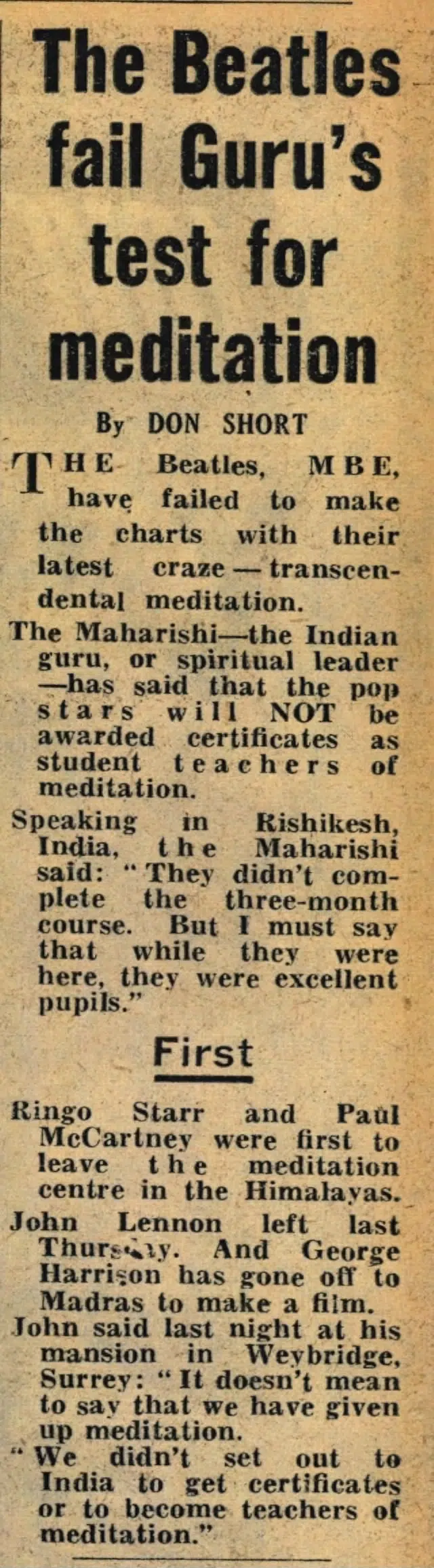 Ringo Starr and Paul McCartney were first to leave the meditation centre in the Himalayas. John Lennon left last Thursday. And George Harrison has gone off to Madras to make a film. John said last night at his mansion in Weybridge, Surrey: “It doesn’t mean to say that we have given up meditation. We didn’t set out to India to get certificates or to become teachers of meditation.”