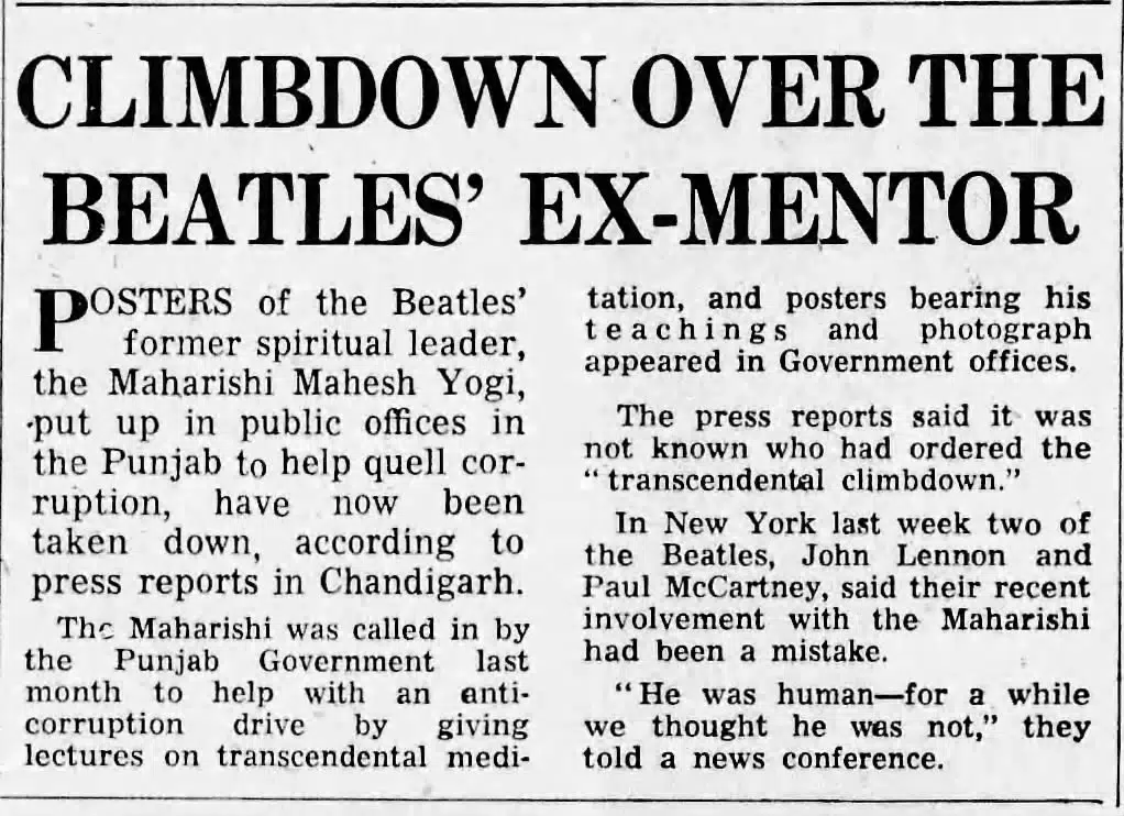 The Maharishi was called in by the Punjab Government last month to help with an anti-corruption drive by giving lectures on transcendental meditation, and posters bearing his teachings and photograph appeared in Government offices. The press reports said it was not known who had ordered the “transcendental climbdown.”