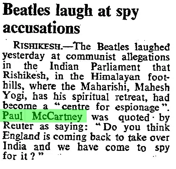 Rishikesh — The Beatles laughed yesterday at communist allegations in the Indian Parliament that Rishikesh, in the Himalayan foothills, where the Maharishi Mahesh Yogi has his spiritual retreat, had become a “centre for espionage”. Paul McCartney was quoted by Reuter as saying: “Do you think England is coming back to take over India and we have come to spy for it?”