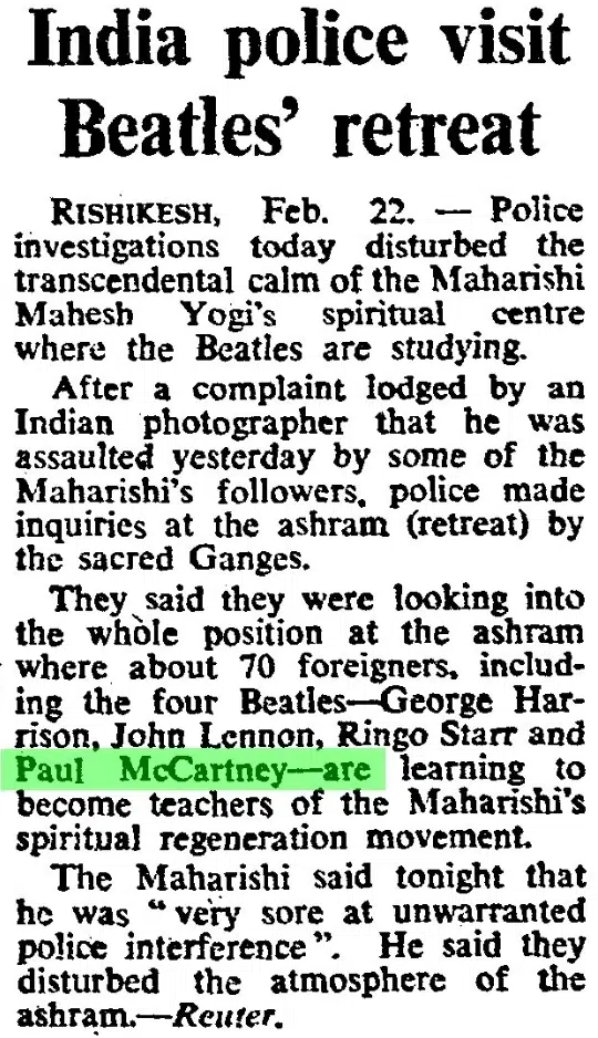 Article Feb 19 to Mar 24, 1968 (Paul) • The Beatles in India