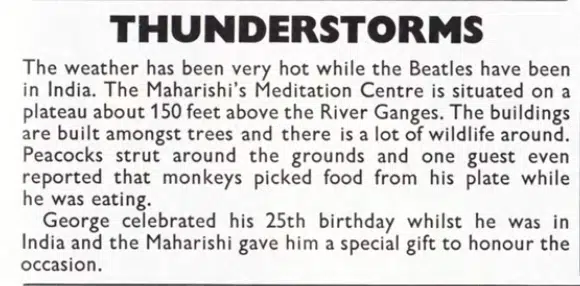 The weather has been very hot while the Beatles have been in India. The Maharishi’s Meditation Centre is situated on a plateau about 150 feet above the River Ganges. The buildings are built amongst trees and there is a lot of wildlife around. Peacocks strut around the grounds and one guest even reported that monkeys picked food from his plate while he was eating.