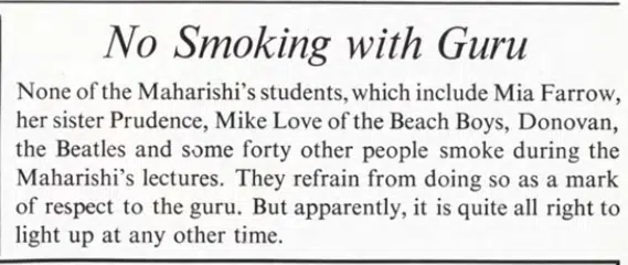 None of the Maharishi’s students, which include Mia Farrow, her sister Prudence, Mike Love of the Beach Boys, Donovan, the Beatles and some forty other people smoke during the Maharishi’s lectures. They refrain from doing so as a mark of respect to the guru. But apparently, it is quite all right to light up at any other time.