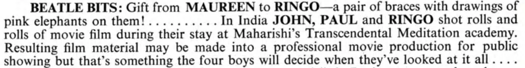 In India JOHN, PAUL and RINGO shot rolls and rolls of movie film during their stay at Maharishi’s Transcendental Meditation academy. Resulting film material may be made into a professional movie production for public showing but that’s something the four boys will decide when they’ve looked at it all ….