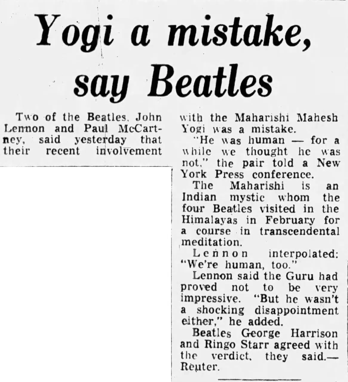 In New York last week two of the Beatles, John Lennon and Paul McCartney, said their recent involvement with the Maharishi had been a mistake. “He was human — for a while we thought he was not,” they told a news conference.