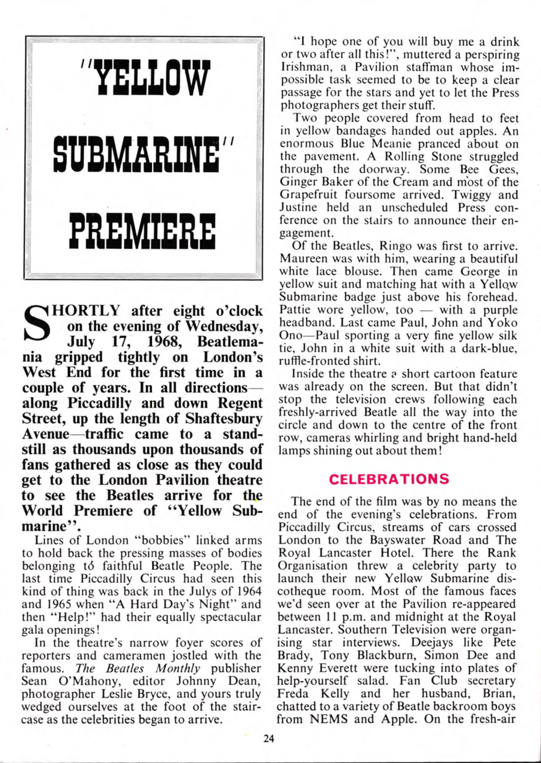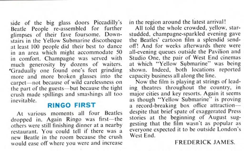 All told the whole crowded, yellow, star-studded, champagne-sparkled evening gave the Beatles’ cartoon film a splendid send-off! And for weeks afterwards there were all-evening queues outside the Pavilion and Studio One, the pair of West End cinemas at which “Yellow Submarine” was being shown. Indeed, both locations reported capacity business all along the line.