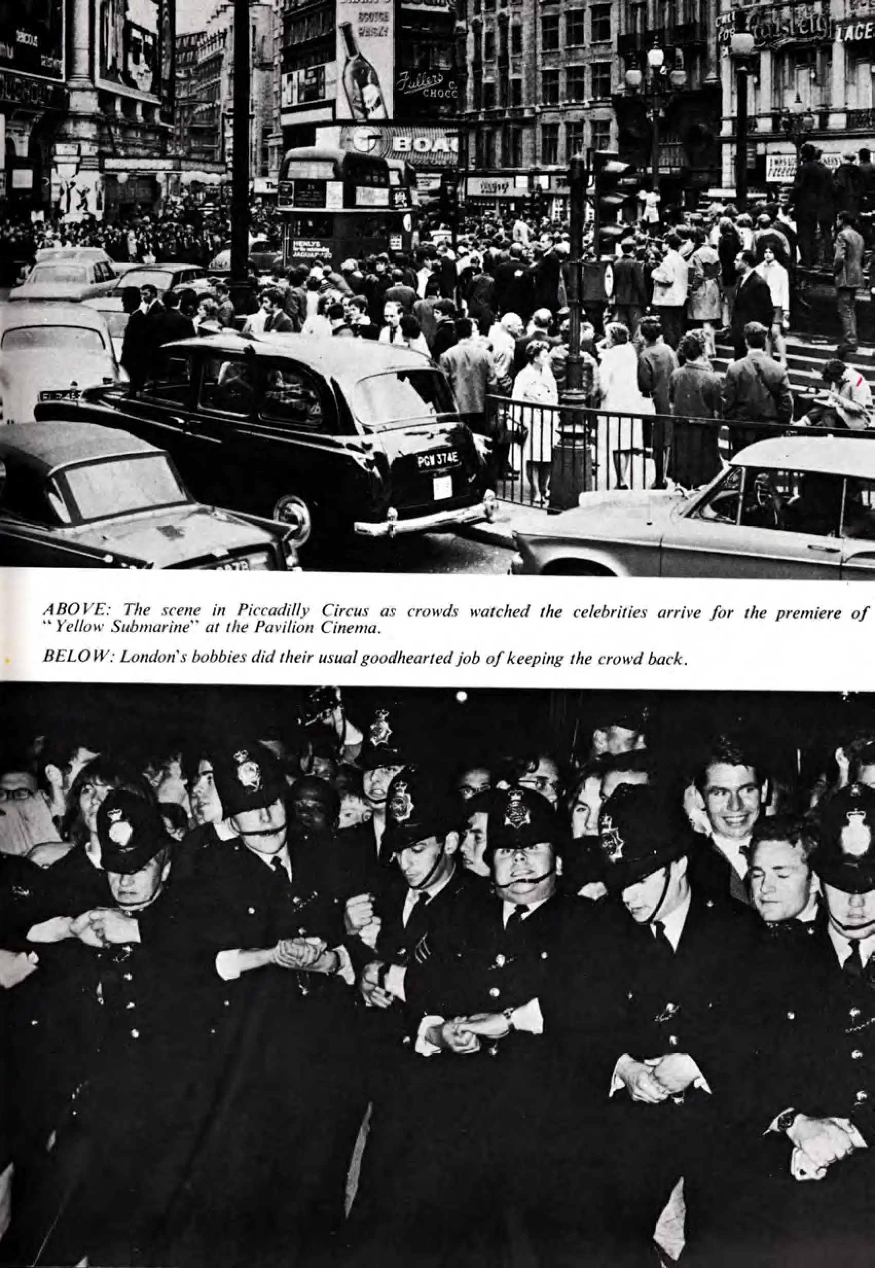 Lines of London “bobbies” linked arms to hold back the pressing masses of bodies belonging to faithful Beatle People. The last time Piccadilly Circus had seen this kind of thing was back in the Julys of 1964 and 1965 when “A Hard Day’s Night” and then “Help!” had their equally spectacular gala openings!