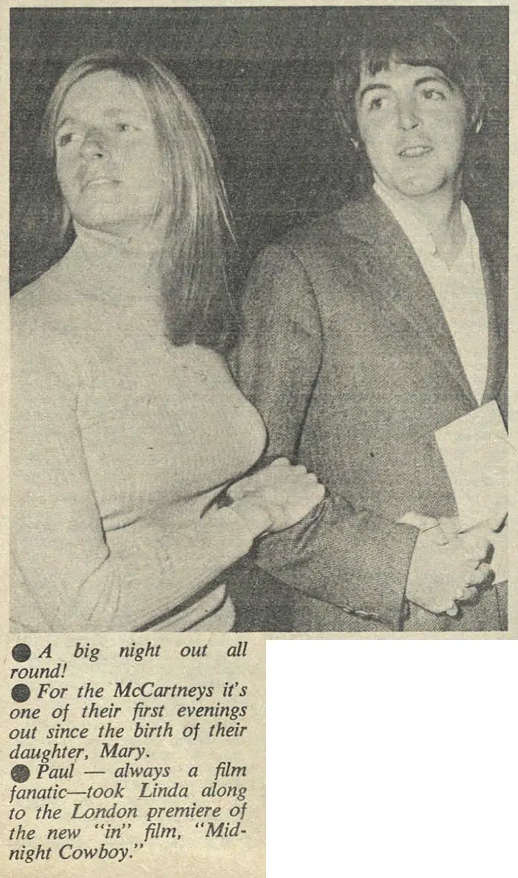 On this day, Paul and Linda McCartney attended the UK premiere of the film “Midnight Cowboy.” The BBC filmed their arrival at the London Pavilion. It would be their last public appearance for several months.