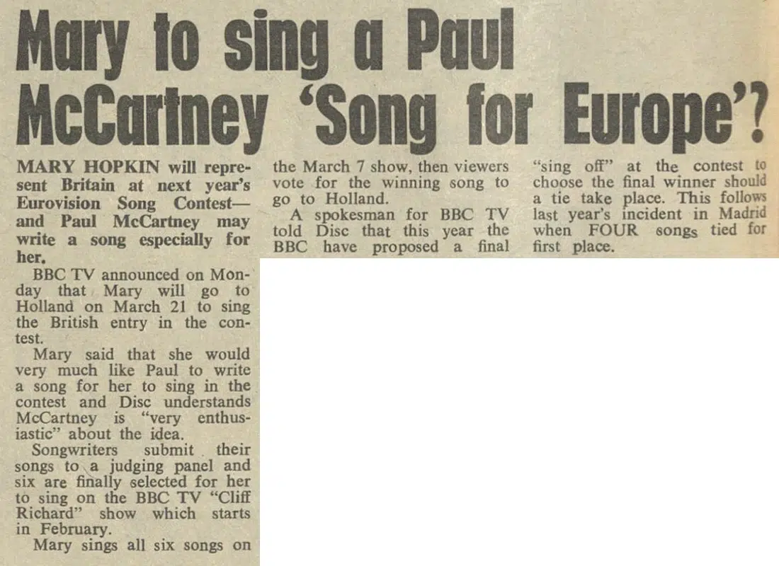 Mary said that she would very much like Paul to write a song for her to sing in the contest and Disc understands McCartney is “very enthusiastic” about the idea.