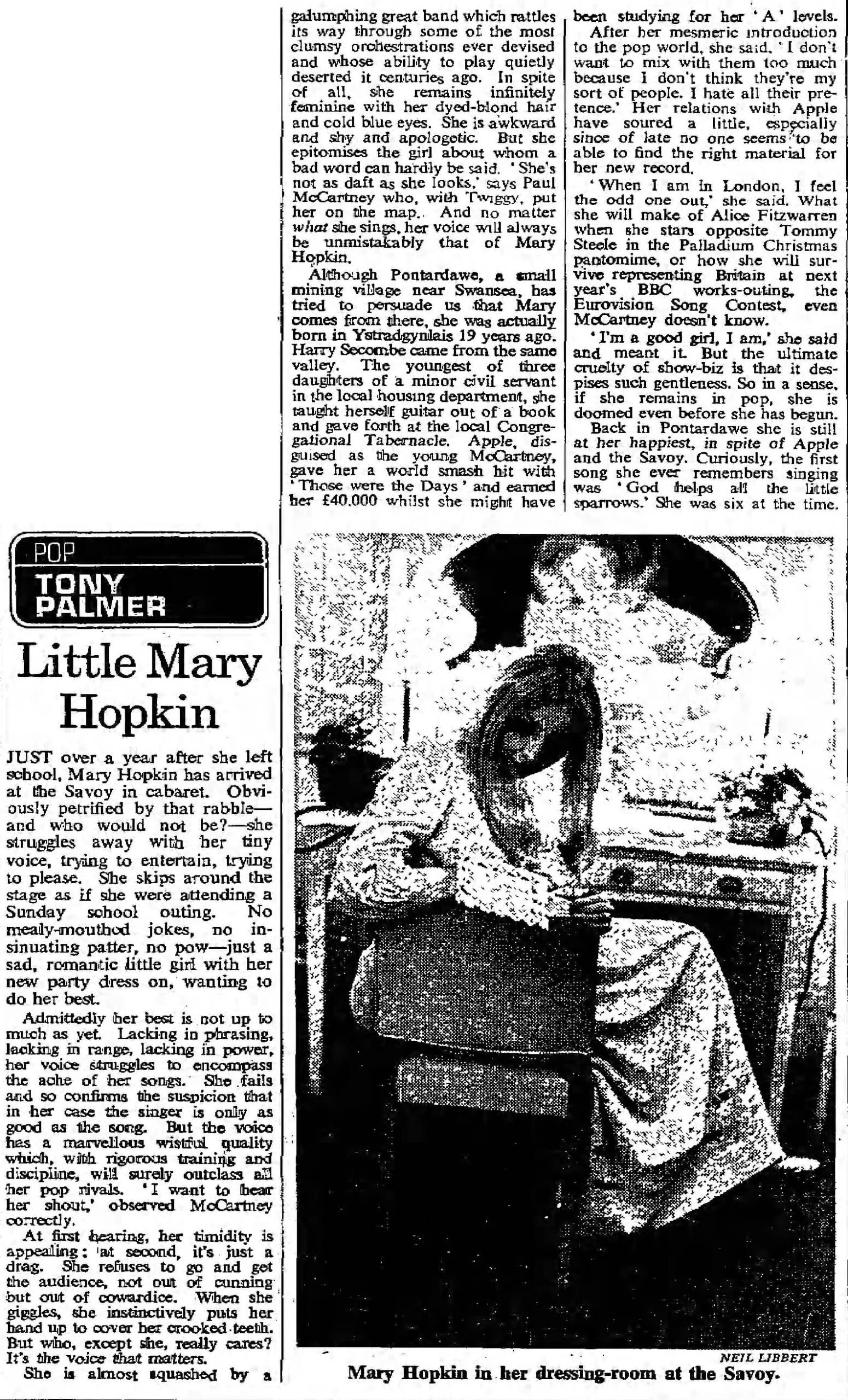 Just over a year after she left school, Mary Hopkin has arrived at the Savoy in cabaret. Obviously petrified by that rabble—and who would not be?—she struggles away with her tiny voice, trying to entertain, trying to please. She skips around the stage as if she were attending a Sunday school outing. No mealy-mouthed jokes, no insinuating patter, no pow—just a sad, romantic little girl with her new party dress on, wanting to do her best.