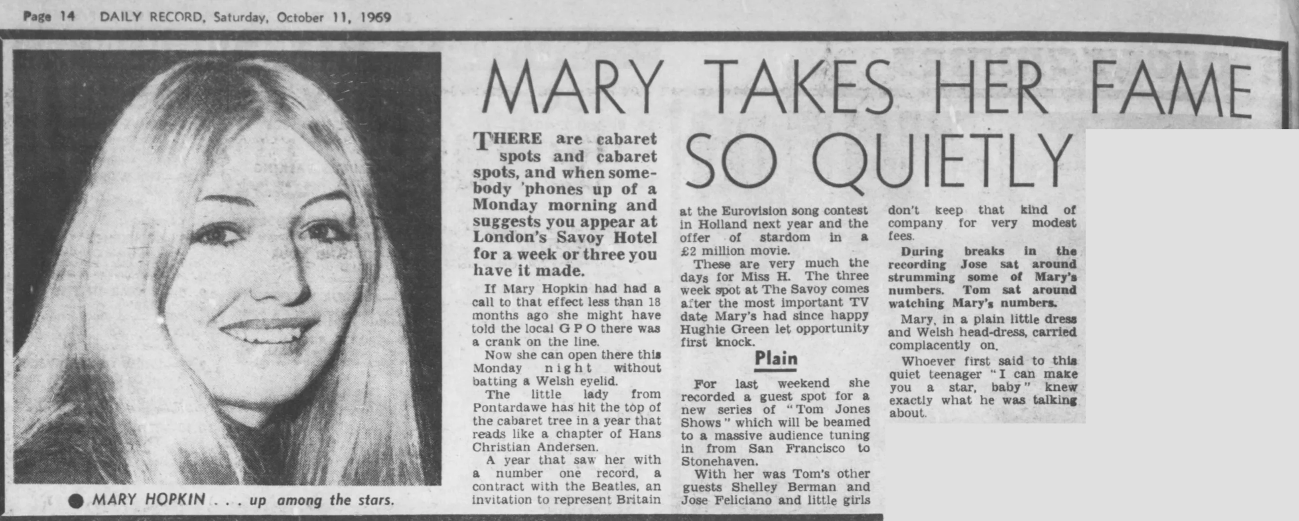 For last weekend she recorded a guest spot for a new series of “Tom Jones Shows” which will be beamed to a massive audience tuning in from San Francisco to Stonehaven. With her was Tom’s other guests Shelley Berman and Jose Feliciano and little girls don’t keep that kind of company for very modest fees. During breaks in the recording Jose sat around strumming some of Mary’s numbers. Tom sat around watching Mary’s numbers. Mary, in a plain little dress and Welsh head-dress, carried complacently on.