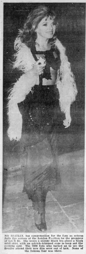 NO BEATLES, but compensation for the fans as actress Julie Ege arrives at the London Pavilion for the premiere of Let It Be. She wears a skimpy black bra above a black midi-skirt, with an ostrich-trimmed cape to keep out the evening cold. The 7000 fans who turned up to see the Beatles attend their new film were out of luck. None of the famous four was there.