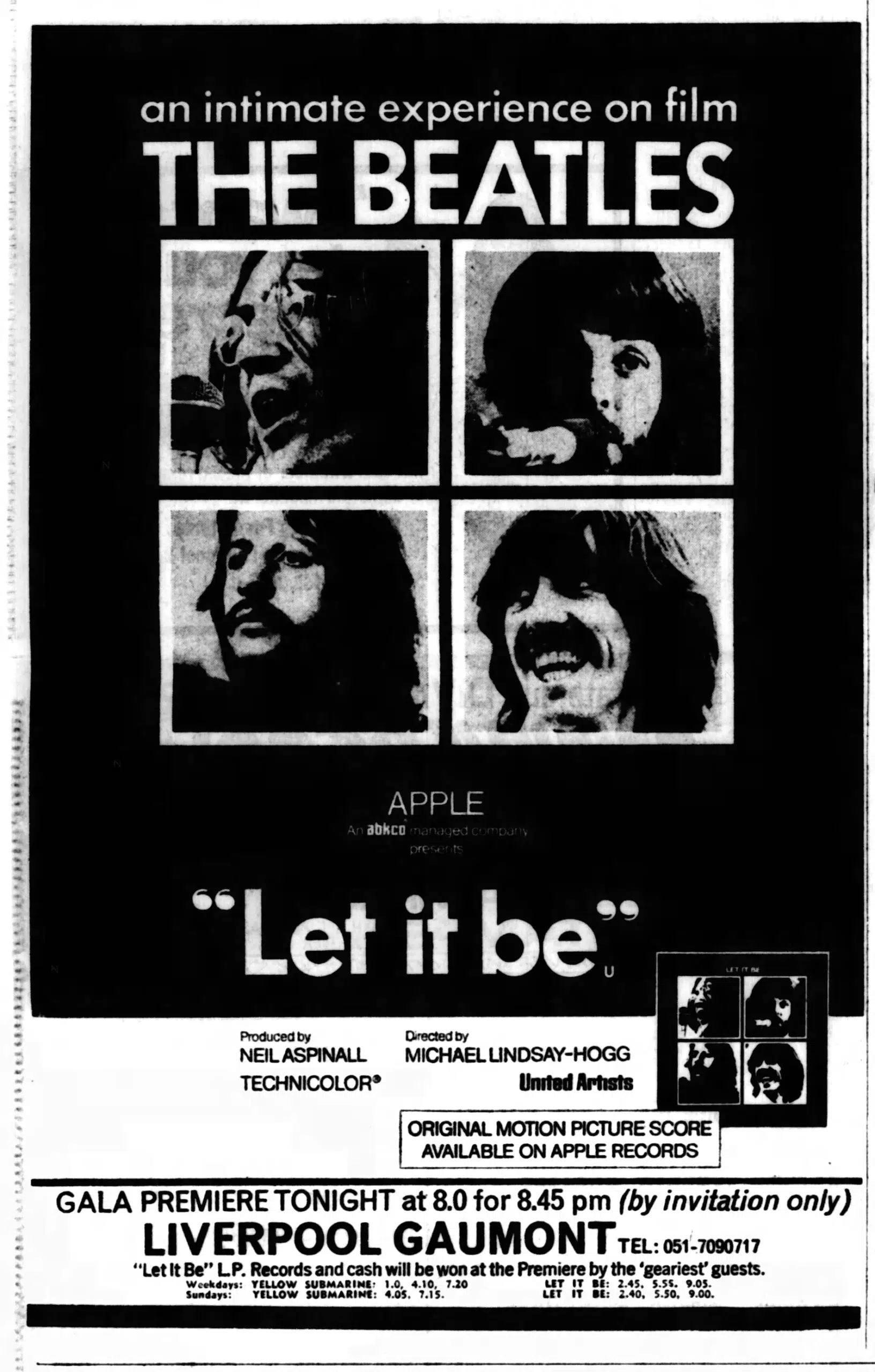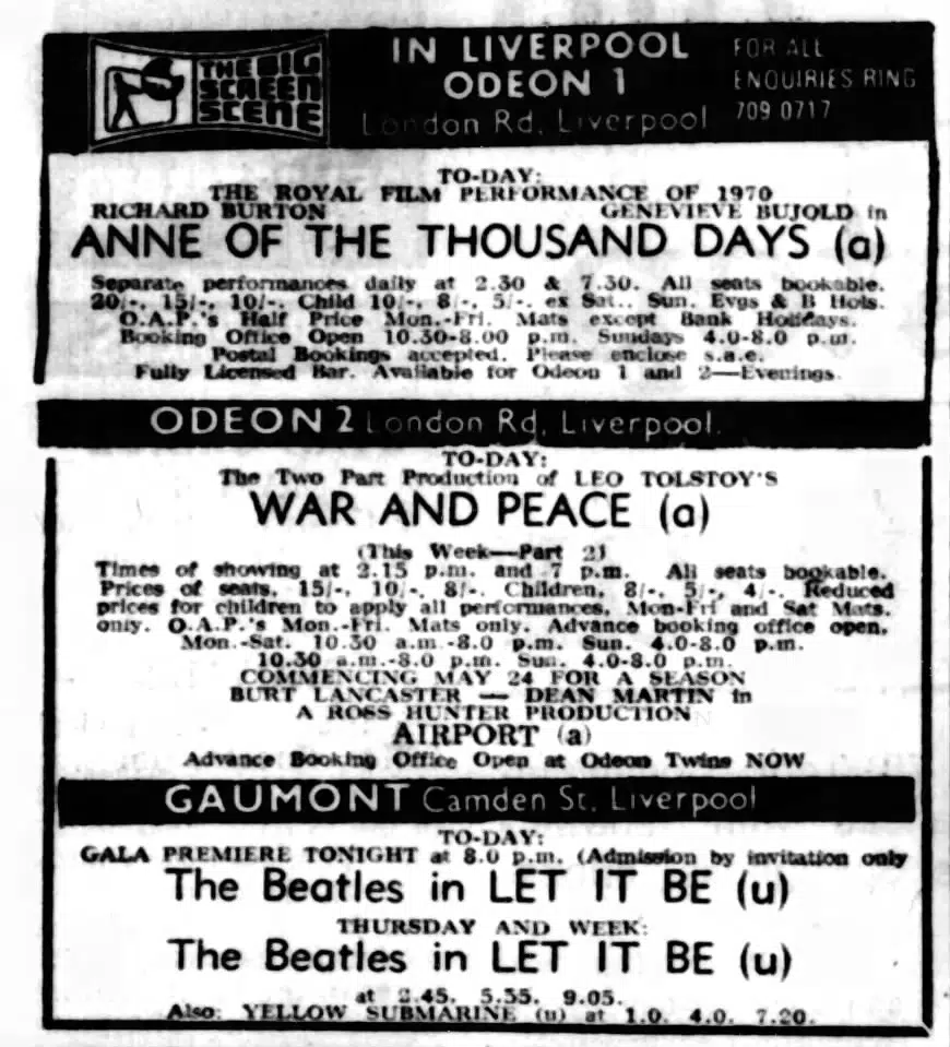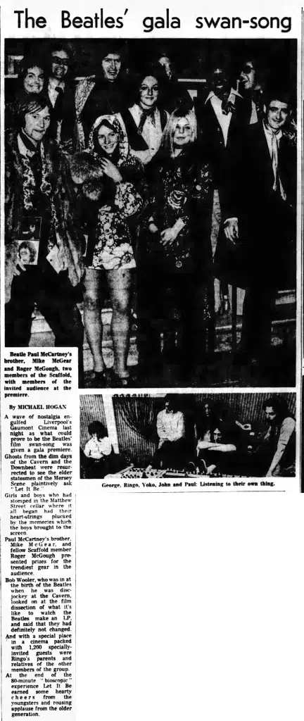 A wave of nostalgia engulfed Liverpool’s Gaumont Cinema last night as what could prove to be the Beatles’ film swan-song was given a gala premiere. Ghosts from the dim days of the Cavern and the Downbeat were resurrected to see the elder statesmen of the Mersey Scene plaintively ask “Let It Be.”