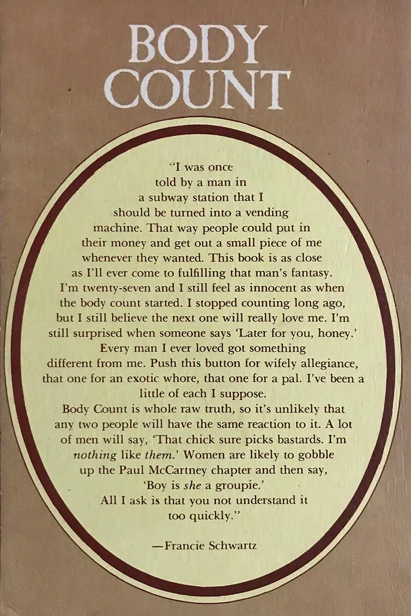 Article November 1972 • Francie Schwartz publishes her autobiography "Body Count"