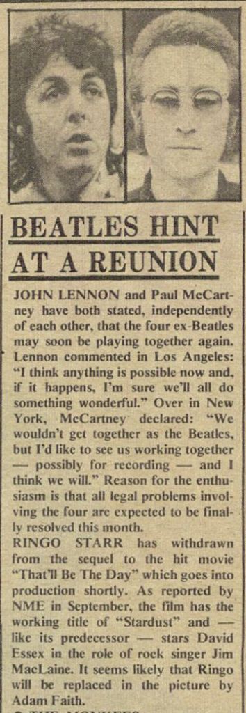 Article January 1974 • Paul McCartney and John Lennon hint at potential Beatles reunion