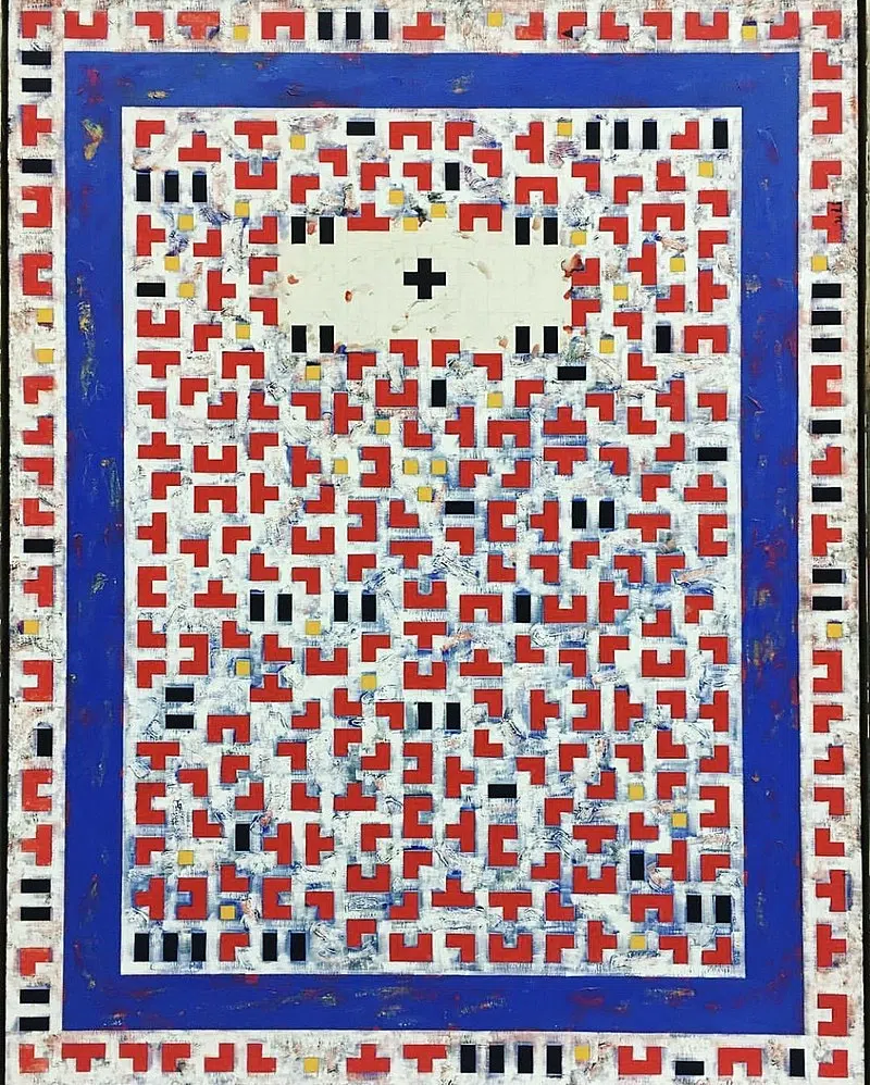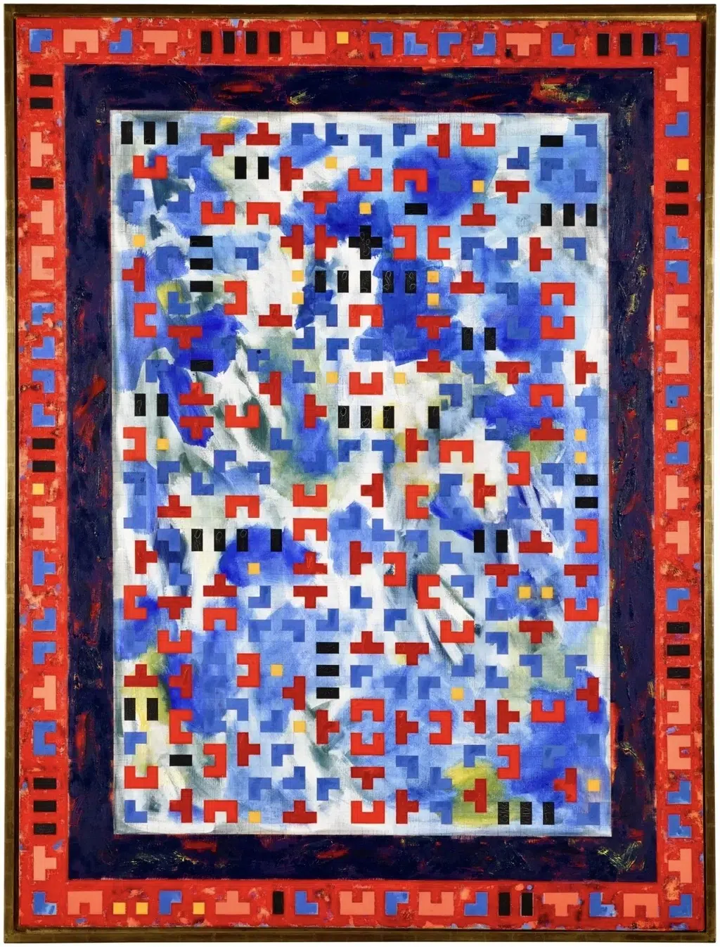 Five autonomous stained glass panels comissioned in 1982 for MPL Communications, together with the painting Tug of War. Each is either a translation or development of Clarke’s painting and cover design for the Paul McCartney album Tug of War; the works appear in the music video for McCartney’s single Take It Away. Each artwork is made of mouth-blown glass: three are direct translations, traditionally leaded, with Clarke’s signature geometric reticules in varying colour; one is flipped 180 degress, and has a progression of free shapes in yellow glass running along the bottom, and calligraphic interruptions to the grid’s leading; the fifth panel has a separate but related geometric layout, with a central section formed of a large single sheet of mouth-blown glass, virtuosically cut.