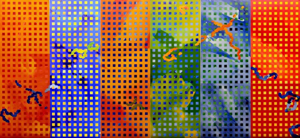 Brian Clarke first made his set designs for The Paul McCartney World Tour as scale designs in acrylic and collage, cutting and tearing his signature grid and amorphic elements by hand, with the full-size stage sets executed by set painters, first on canvas and then on acoustically transparent scrim as the show was expanded for larger venues. The tour, McCartney’s first under his own name, played to 2,843,297 people between ’89 and ’90, and promoted the album Flowers in the Dirt, whose cover Clarke had designed in collaboration with Linda McCartney. The paintings were at the time Clarke’s largest ever, superseded a few years later by his world-record-setting painted sets for McCartney’s The New World Tour (1992–93).
