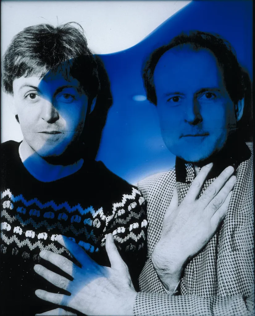 Occasionally Linda McCartney and I did little groups of these collaboration panels for actual places: there was a cottage hospital in Rye in East Sussex close to where we lived, and we made a group of ten of one of her black and white photographs of a leaf, screenprinted onto stained glass and repeated, like an Andy Warhol, which we jointly gifted, together with another set of a swan. Once it’s repeated decoratively like that, the leaf has a vitality to it that it doesn’t as a single image. These leaves had perfectly formed holes – you know how leaves, when they fall, can sometimes decay? I don’t know if they’d been eaten out by a caterpillar or if it’s just nature, but I love the way it renders with these bits missing from it. Highlighting spots of water fallen around it as blue somehow gave it a cartoony, kind of Walt Disney feel to it that I enjoyed. And we did another series for the cancer ward at Hammersmith Hospital, and put one panel over each bed, just to cheer people up a bit. They’re still there I think. They made that ward just a little bit warmer, added an optimistic sparkle to a place that’s generally pretty demanding to be in.
