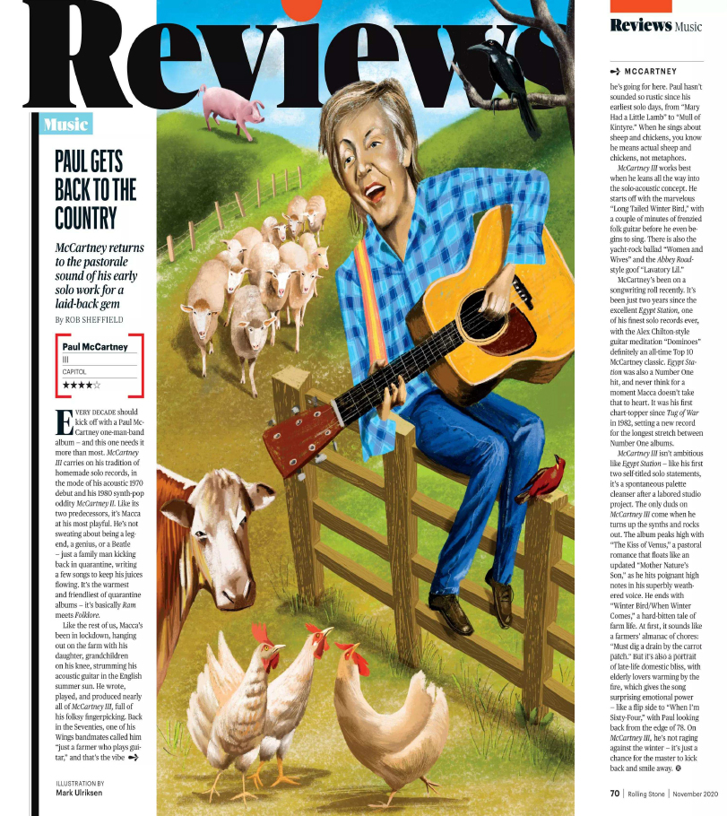 RollingStone, in its US edition of November 2020, was the first publisher to write a review of “McCartney III“, more than one month ahead of its official release. The review was pretty positive, and nicely illustrated.