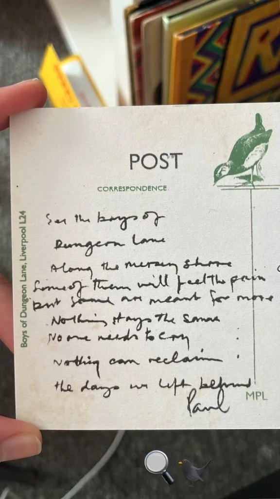 On March 26, user p.s.iloveyoupaul on Instagram posted the photo of a postcard (s)he received from MPL. It features some text written with the handwriting of Paul McCartney: