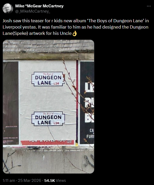 In the early hours of March 25, 2026, Paul’s brother Mike posted a message on X appearing to reveal the title of the new album, “The Boys Of Dungeon Lane“, along with a logo styled to resemble a British street sign. He explained that the logo had been designed by his son Josh, Paul’s nephew.
