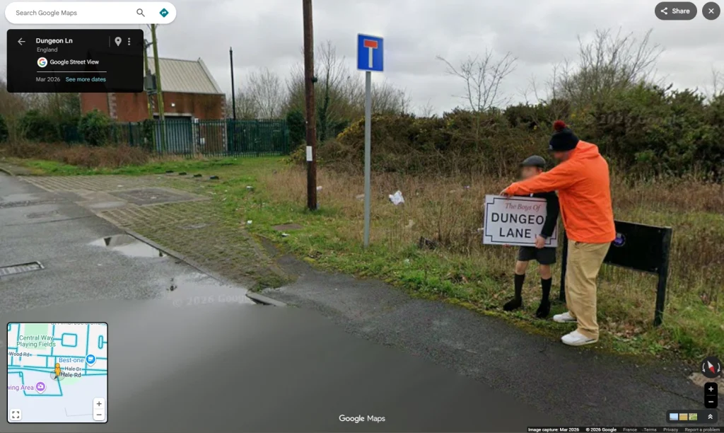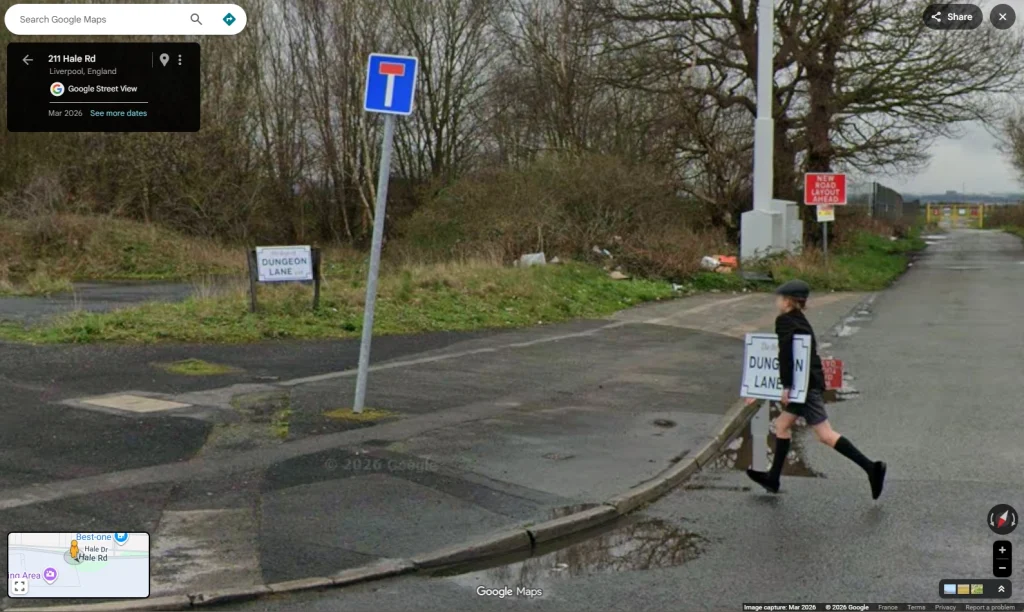 Fans then began researching Dungeon Lane and quickly noticed that, on Google Street View, at the junction of Dungeon Lane and Hale Road in Speke, a boy dressed in 1950s-style clothing could be seen running with a sign reading “The Boys Of Dungeon Lane.” Those photos were taken on March 6, 2026, according to pano date resolver.