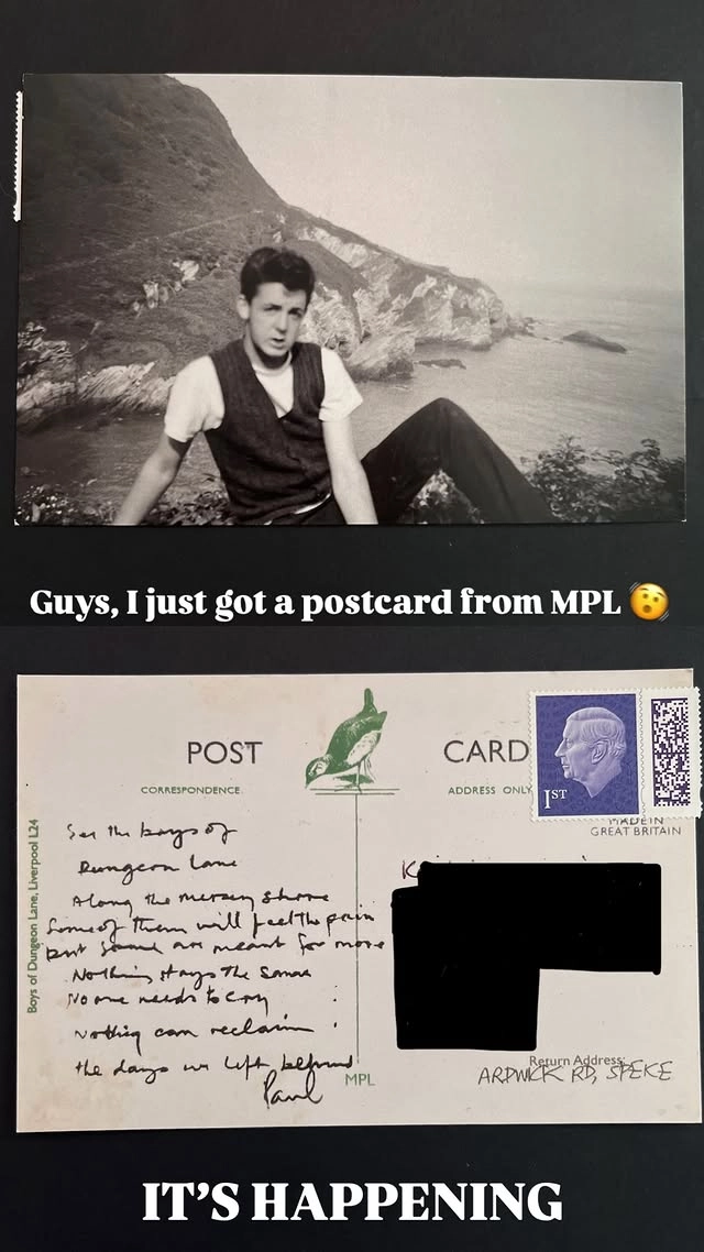 On March 26, user p.s.iloveyoupaul on Instagram posted the photo of a postcard (s)he received from MPL. It features some text written with the handwriting of Paul McCartney: