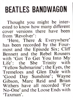 ‘Here, There & Everywhere’ has been recorded by the Fourmost and the Episode Six; Cliff Bennett and the Rebel Rousers with ‘Got To Get You Into My Life’; the She Trinity with ‘Yellow Submarine’; the Eyes, the Tremeloes and Glen Dale with ‘Good Day Sunshine’; Wayne Gibson, Marc Reid and Brian Withers have all recorded ‘For No One’ and the Loose Ends with ‘Taxman’.