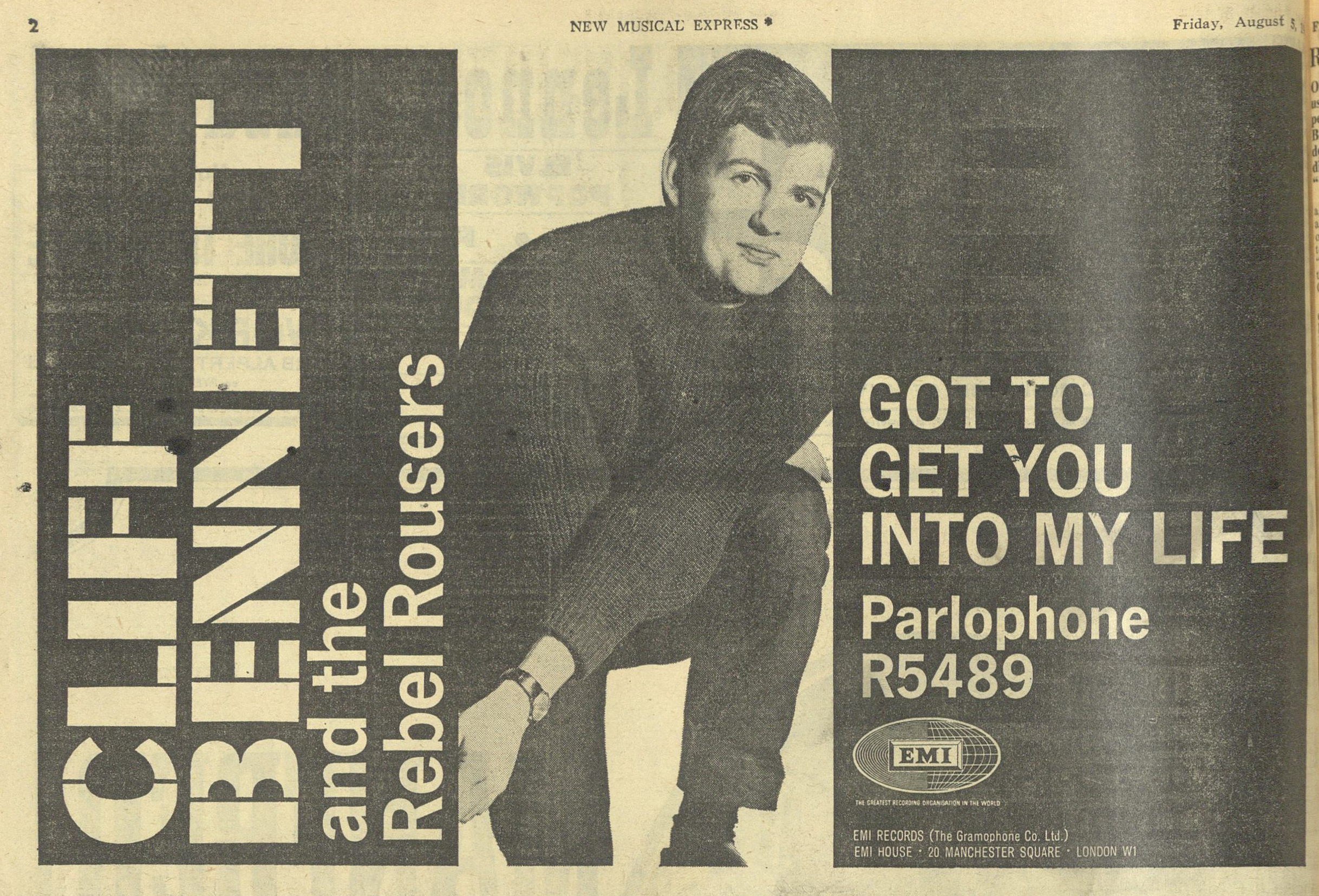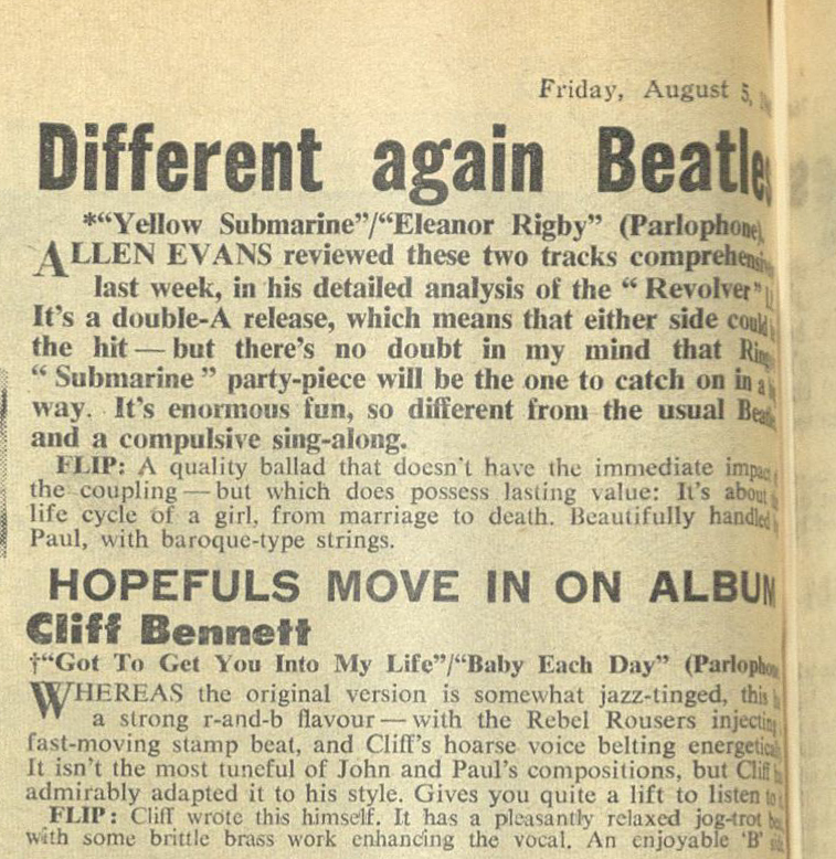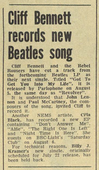 Cliff Bennett and the Rebel Rousers have cut a track from the forthcoming Beatles LP as their next single. Titled “Got To Get You Into My Life”, it is released by Parlophone on August 5, the same day as “Revolver”. It is understood that John Lennon and Paul McCartney, the composers of the song, invited Cliff to record it.